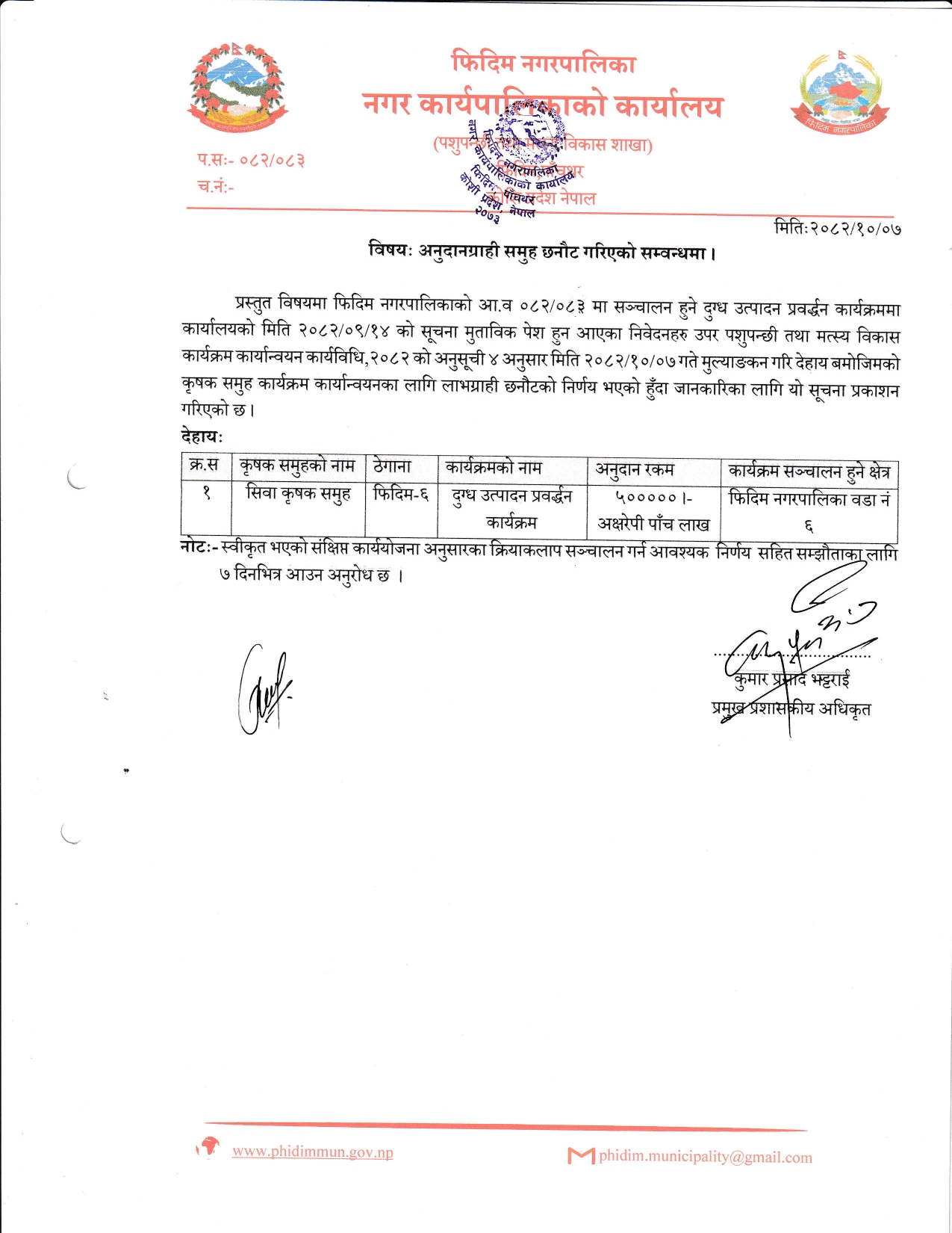 अनुदानग्राही छनौट गरिएको सम्बन्धमा