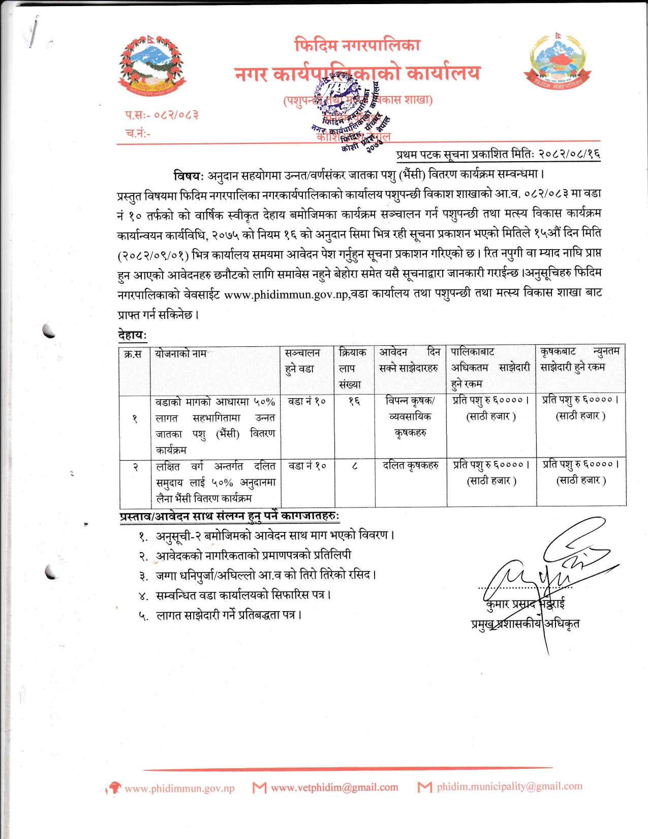 अनुदान सहयोगमा उन्नत/वर्ण शंखर जातको भैंसी वितरण सम्बन्धमा